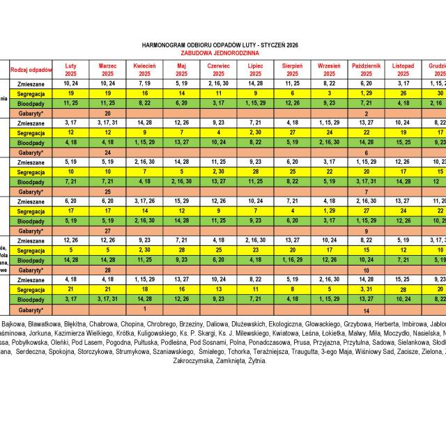 Informujemy, że obowiązuje nowy harmonogram odbioru odpadów komunalnych na okres od 1 lutego 2025 r. do 31 stycznia 2026 r.