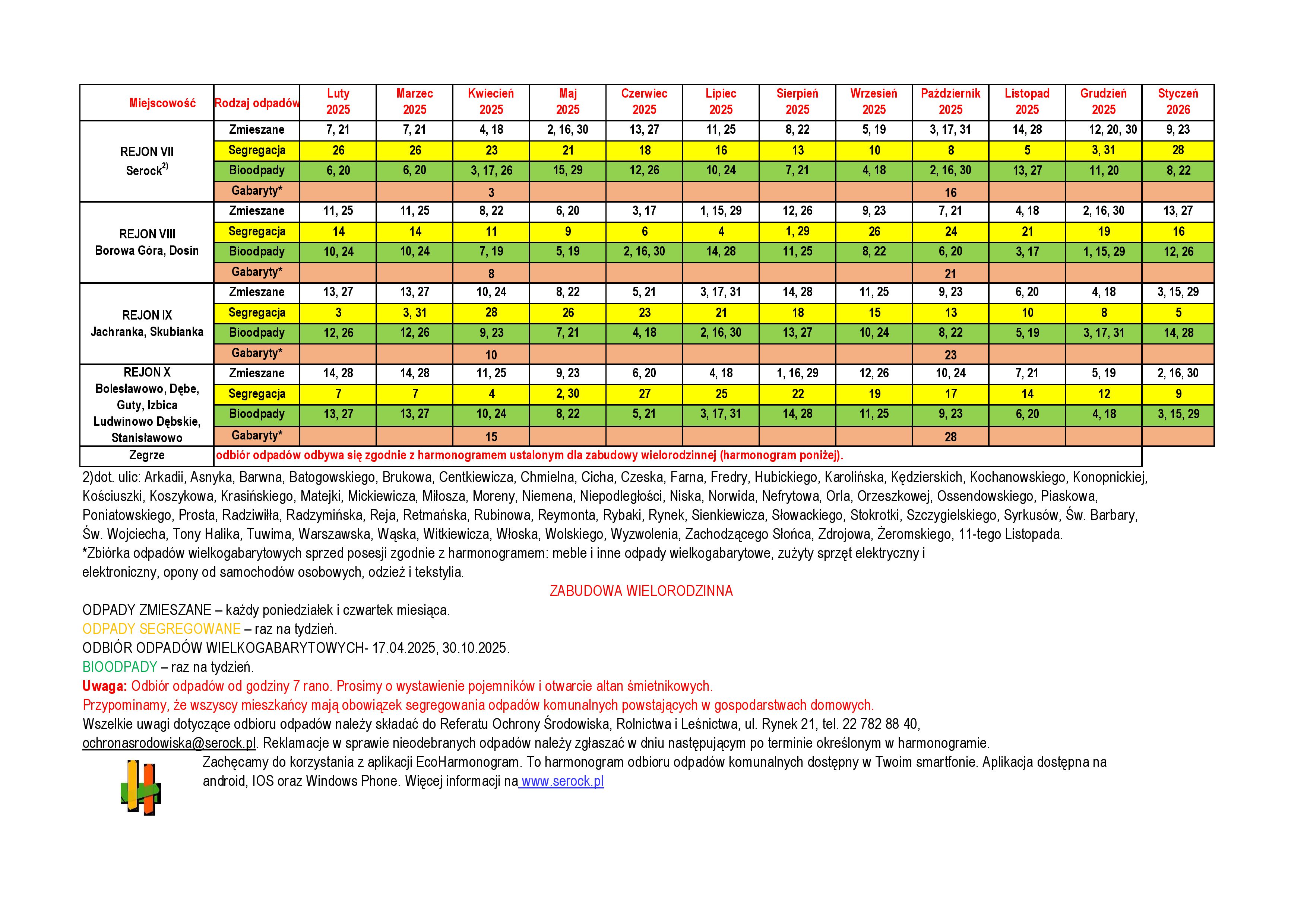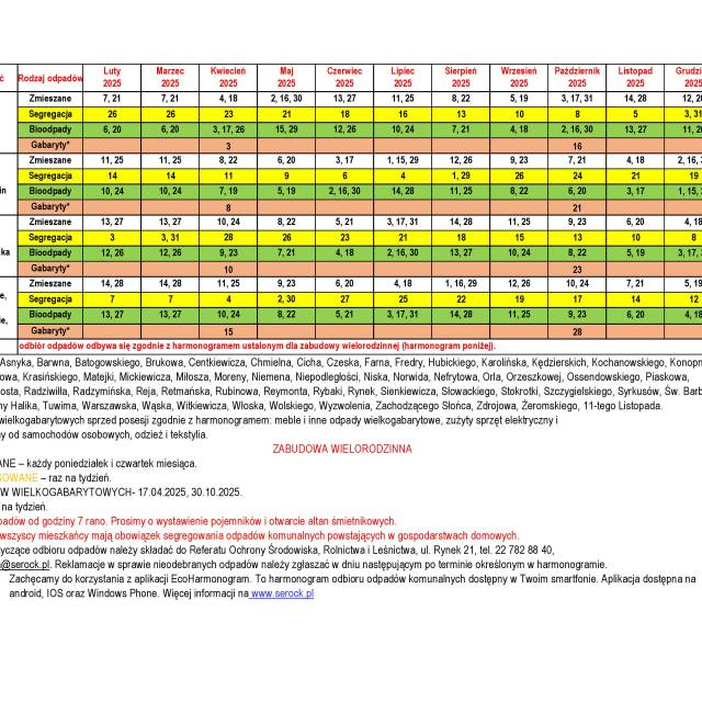 Aktualny harmonogram jest dostępny w zakładce DLA MIESZKAŃCA → OCHRONA ŚRODOWISKA → ODPADY KOMUNALNE/NIECZYSTOŚCI CIEKŁE (https://serock.treespot.pl/.../harmonogram-odbioru-odpadow).