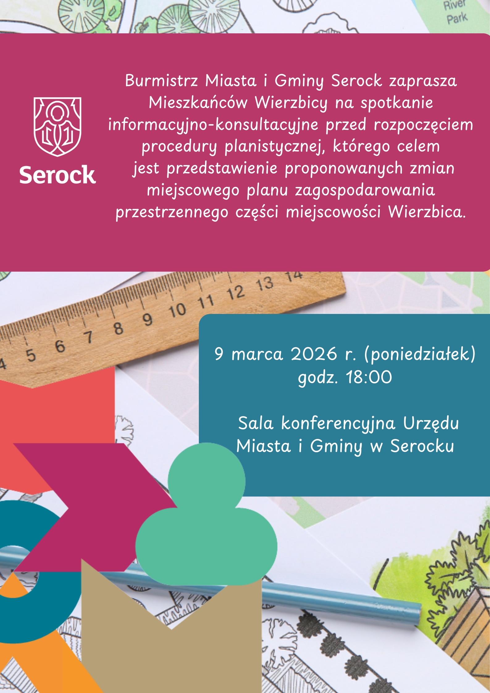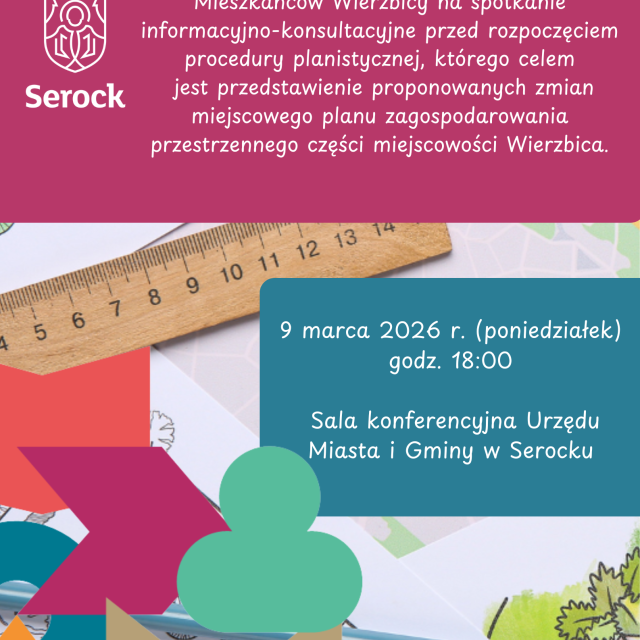 Burmistrz Miasta i Gminy Serock zaprasza Mieszkańców miejscowości Wierzbica na spotkanie informacyjno-konsultacyjne dotyczące planowanych zmian w miejscowym planie zagospodarowania przestrzennego.