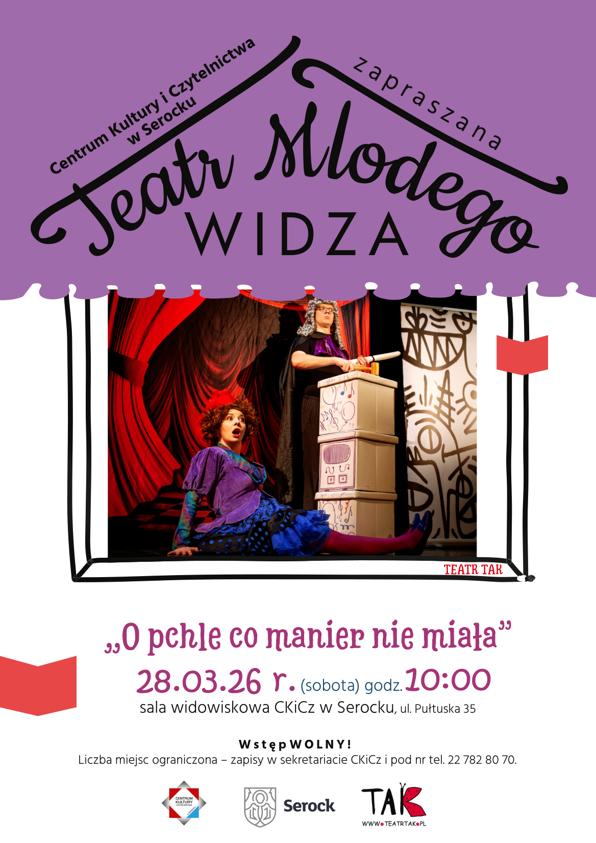 Zapraszamy na kolejne spotkanie w ramach cyklu Teatr Młodego Widza na spektakl „O pchle, co manier nie miała” w wykonaniu Teatru TAK. Inspirowany tekstem „Pchła Szachrajka” Jana Brzechwy.