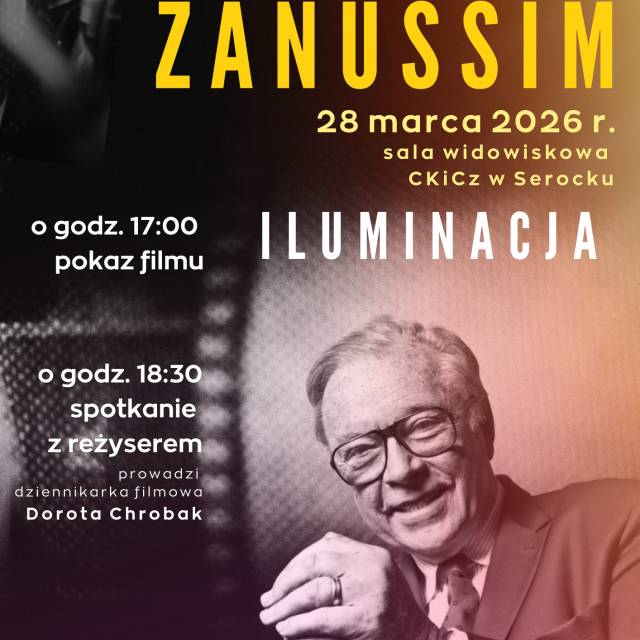 Już 28 marca 2026 r. w Serocku odbędzie się spotkanie z mistrzem kina, reżyserem, scenarzystą i producentem filmowym Krzysztofem Zanussim. To niepowtarzalna okazja, by zobaczyć film „Iluminacja” i osobiście wysłuchać rozmowy z reżyserem.