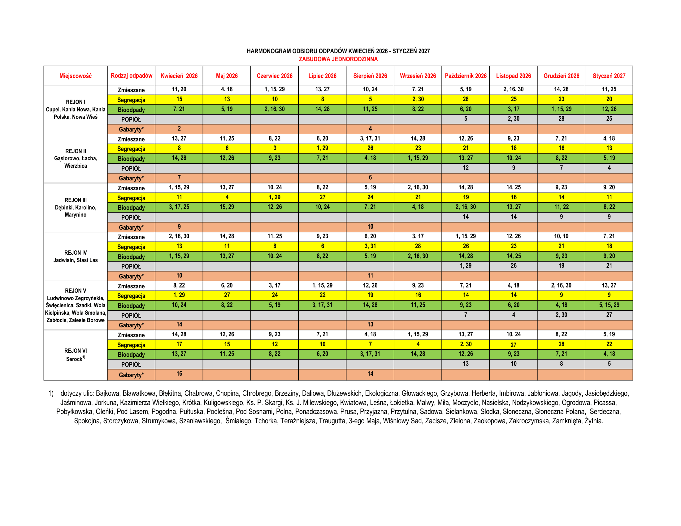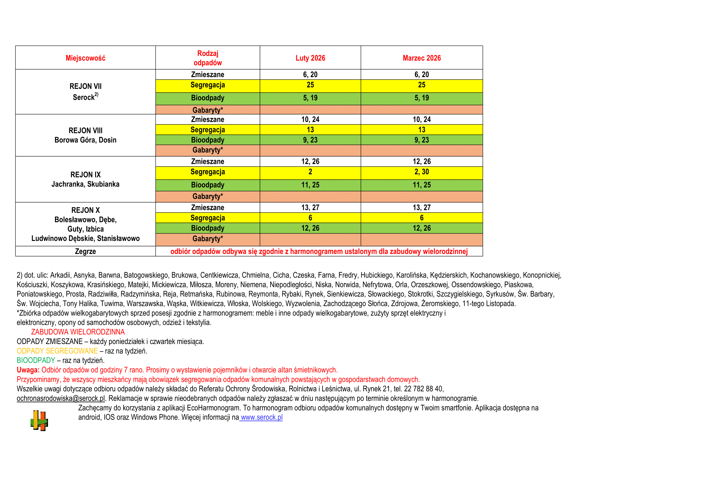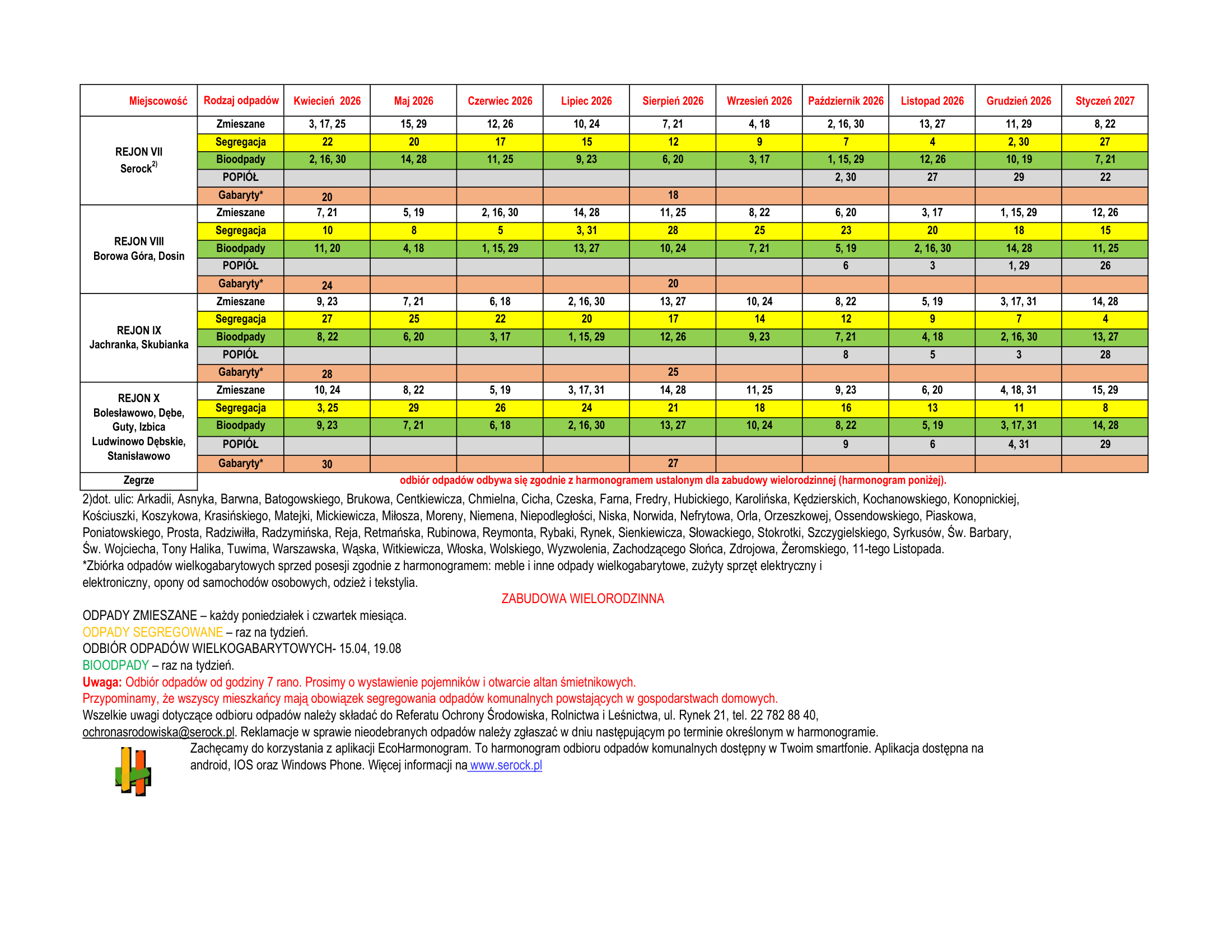 Wszelkie uwagi dotyczące odbioru odpadów należy składać do Referatu Ochrony Środowiska, Rolnictwa i Leśnictwa, ul. Rynek 21, tel. 22 782 88 40, ochronasrodowiska@serock.pl. Reklamacje w sprawie nieodebranych odpadów należy zgłaszać w dniu następującym po terminie określonym w harmonogramie.